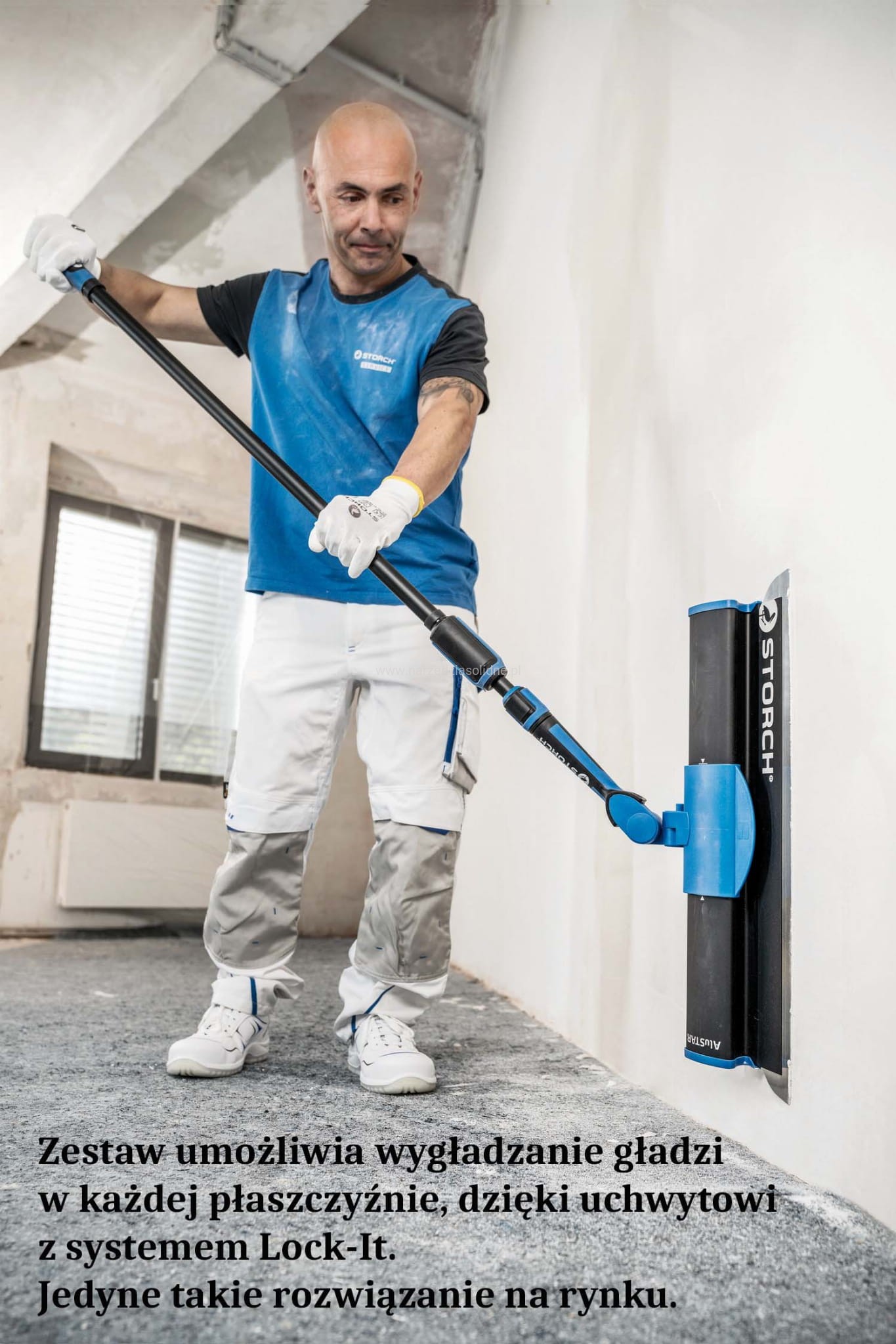 - System Storch Lock-It: wzmocniony kij teleskopowy (118-210 cm) w połączeniu z adapterem pozwala na komfortowe szpachlowanie sufitów i wysokich ścian bez użycia drabin.